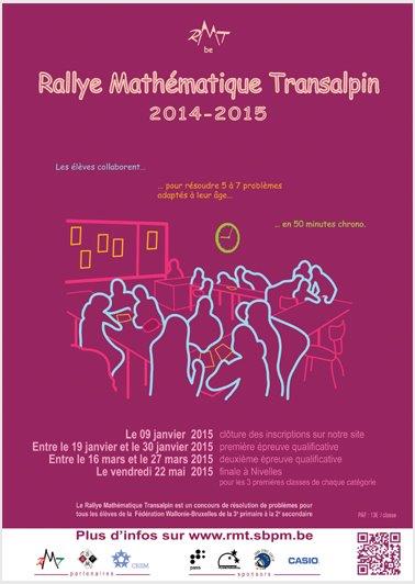 Nous sommes ravis d’annoncer l’ouverture du 23e Rallye Mathématique Transalpin. Pour cette édition 2014-2015, le RMT a le plaisir de vous accueillir sur son tout nouveau site web, qui est hébergé à la même adresse qu’auparavant (http://www.rmt.sbpm.be). Vous y trouverez toutes les informations nécessaires telles que le règlement, l’agenda, l’affiche et le flyer de cette nouvelle édition, les anciennes épreuves et, surtout, l’épreuve d’essai pour commencer dès maintenant une belle année avec le RMT.