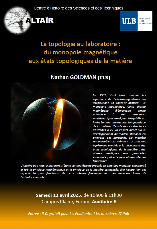 En 1931, Paul Dirac revisite les équations de l’électromagnétisme en introduisant un concept abstrait : le monopole magnétique. Cette charge magnétique élémentaire donne naissance à des structures mathématiques exotiques lorsqu’elle est intégrée dans une description quantique de la matière. L’étude de ces structures abstraites a eu un impact direct sur le développement du modèle standard en physique des particules. De manière remarquable, ces mêmes structures ont également conduit à la découverte des états topologiques de la matière : des phases exotiques aux propriétés étonnantes, directement observables en laboratoire. L’histoire que nous explorerons s’étend sur un siècle de progrès en physique moderne, couvrant à la fois la physique mathématique et la physique de la matière condensée. Elle illustre l’un des aspects les plus fascinants de cette science fondamentale : les avancées issues de l’interdisciplinarité.