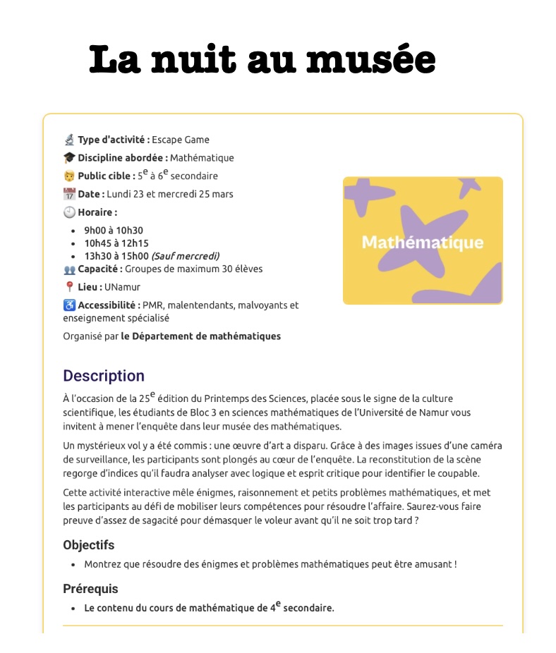 A l’occasion de la 25ème Ă©dition du Printemps des Sciences, placĂ©e sous le signe de la culture scientifique, les Ă©tudiants de Bloc 3 en sciences mathĂ©matiques de l’UniversitĂ© de Namur vous invitent Ă mener l’enquĂŞte dans leur musĂ©e des mathĂ©matiques.