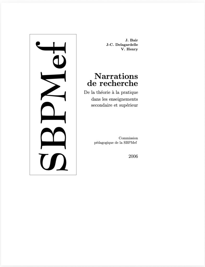 A l’heure de la formation par compétences, des théories socio-constructivistes de l’apprentissage et de l’interdisciplinarité, les narrations de recherche, outil didactique mis au point à la fin des années 80 par une équipe de l’IREM de Montpellier, semblent s’inscrire tout naturellement dans cette mouvance où la pédagogie est davantage tournée vers l’élève. Centré sur l’ensemble des démarches effectuées par l’apprenant lors du processus de résolution d’un problème, cet exercice requiert de l’élève qu’il relate les différentes étapes qui ont jalonné sa recherche : pistes envisagées, qu’elles aient été fructueuses ou non, documentation consultée, personnes contactées, erreurs ou découvertes … Une grande importance est ici attachée à la description sincère de l’investissement consacré à l’exercice.