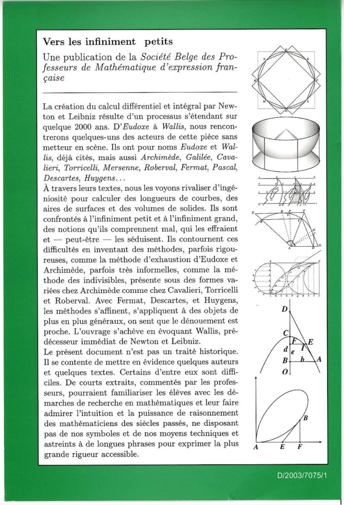 Ce document n’est pas un traité historique. Il se contente, de mettre en évidence par leurs textes quelques auteurs dont les travaux ont contribué à la clarification de notions telles que l’infini et les infiniment petits : Eudoxe, Archimède, Galilée, Cavalieri, Torricelli, Roberval, Fermat, Pascal, Descartes, Huygens, …