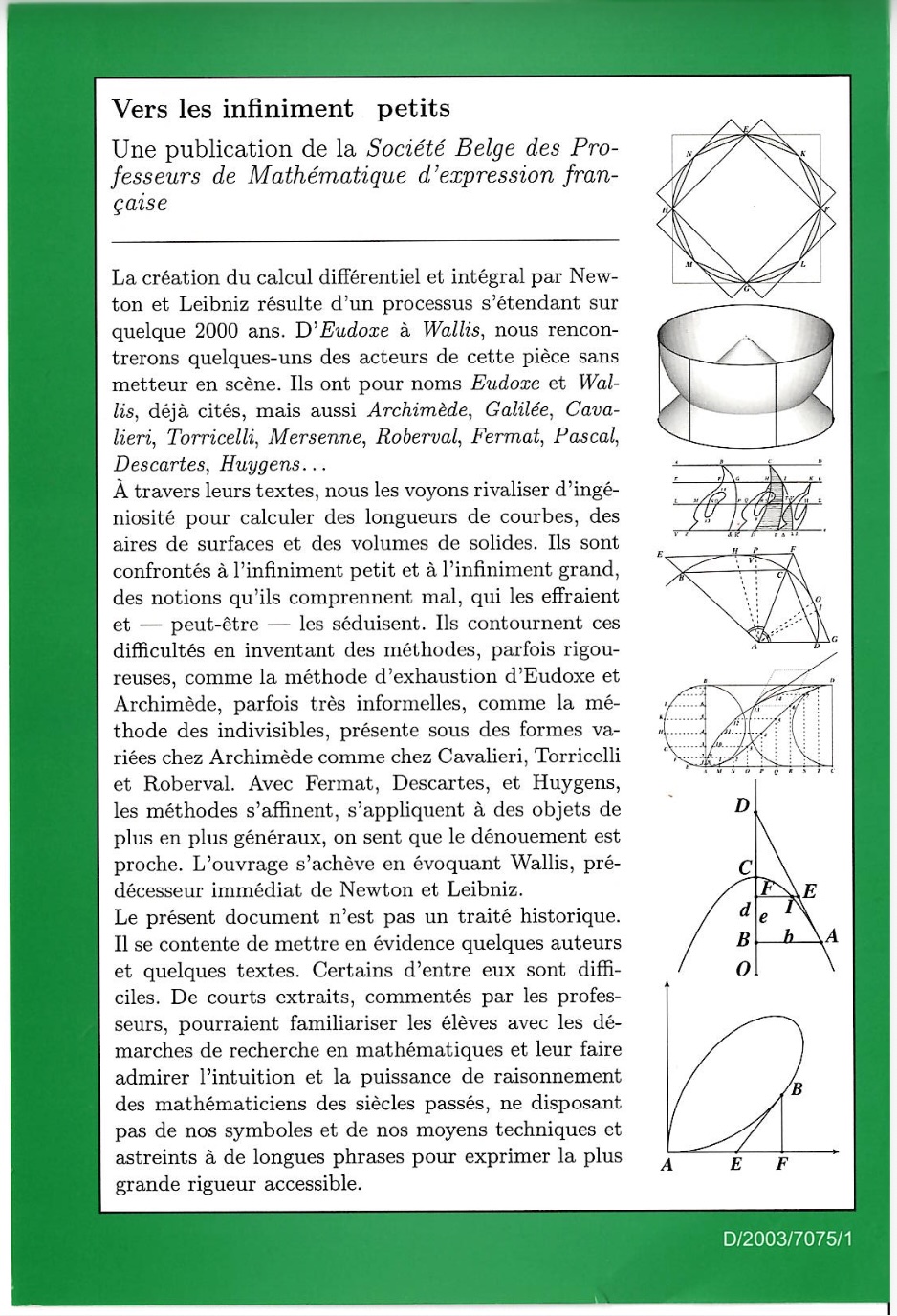 L’ouvrage s’achève en évoquant Wallis, prédécesseur immédiat de Newton et Leibniz. Sommaire : 1. Eudoxe de Cnide, 2. Archimède, 3. Galilée, 4. Cavalieri, 5. Torricelli, 6. De Roberval à Wallis